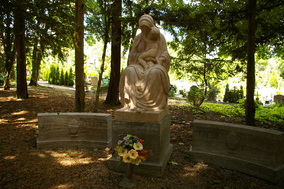 Pomnik nagrobny rodziny Meister – pas zieleni przy al. Okólnej przed kwaterą 1B. Utrzymany w formach klasycyzującego modernizmu. Dzieło rzeźbiarza Christiana Nüssleina z Cassel. Czas powstania ok. 1920 r. Pomnik o wym. wys. 220 cm x szer. 390 cm x głęb. 102,5 cm, wykonany został z piaskowca z użyciem technik kamieniarskich i rzeźbiarskich. Złożony z umieszczonej na postumencie rzeźby przedstawiającej siedzącą postać kobiety, tulącej nagie dziecko oraz z dwóch niskich, kamiennych ścianek ustawionych po bokach, na narysie półkola. Na niskim cokole, stanowiącym integralną część rzeźby, z lewej strony widoczna sygnatura: „CHR. NŰSSLEIN CASSEL”. Na frontowej (krótszej) stronie właściwego cokołu napis: „MEISTER”. Na stojących po obu stronach cokołu ściankach bocznych inskrypcje: na lewej - „GUSTAV MEISTER/ *31.8.1855/ +21.6.1939”, na prawej - „TONI MEISTER GEB. WOLF/ *11.12.1898/ +3.4.1920”.