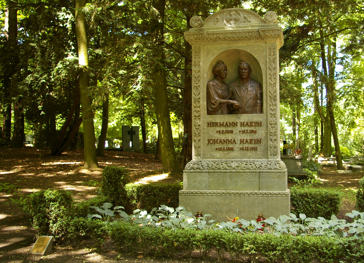 Poświęcony pamięci Hermanna Hakena - nadburmistrza Szczecina w latach 1878-1907 oraz jego żony Johanny. Eklektyczny, będący dziełem nieznanego warsztatu niemieckiego, powstałym po 1916 r. wg projektu szczecińskiego rzeźbiarza prof. Ludwiga Manzla. Wykonany z piaskowca przy zastosowaniu technik kamieniarskich i rzeźbiarskich. Ma kształt wolnostojącej aediculi, w której umieszczono popiersia zmarłych, (wym. wys. 325 cm x szer. 157 cm x gł. 80 cm) z wydzielonym cokołem, konchowo zamkniętą niszą w partii środkowej, zwieńczony gzymsem i półkolistym naczółkiem. Nagrobek zdobiony płaskorzeźbionym ornamentem roślinnym - w górnej krawędzi cokołu z liści akantu, w zwieńczeniu motywem plecionki, po bokach ścianki czołowej ujęty pasami z motywem różnorodnych kwiatów. Do roku 2007 pozbawiony metalowego popiersia małżonków (w niszy), metalowego napisu poniżej oraz pierwotnego ogrodzenia mogiły. Pierwotnie stał na kwaterze 20d. Po 1945 r. pozbawiony wizerunków i napisów, otoczony nowymi pochówkami. W 2006 r. poddany konserwacji na koszt Zachodniopomorskiego Wojewódzkiego Konserwatora Zabytków i przeniesiony na obecne miejsce przy lapidarium. W niszy nagrobka popiersia małżonków zrekonstruowane na koszt dawnych niemieckich mieszkańców Szczecina (dzieło artystki rzeźbiarki Moniki Szpener). Więcej >