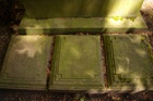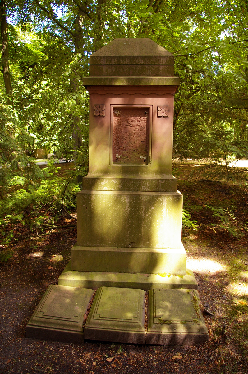 Wśród drzew widzimy m.in. wykonany z czerwonego piaskowca nagrobek słynnego rzeźnika, producenta wędlin Otto Freybe.