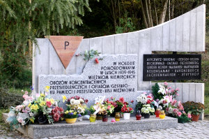 Pomnik składa się z betonowego cokołu z okładziną z lastrico i płyty pionowej z betonu surowego z fakturą deskowania, na której umieszczono napis: W hołdzie pomordowanym w latach 1939-1945 więźniom niemieckich obozów koncentracyjnych przesiedleńczych i ofiarom gestapo - ku pamięci i przestrodze - byli więźniowie. Na pionowej marmurowej płycie, umieszczonej obok, wymienione są nazwy obozów : Auschwitz-Birkenau, Bergen-Belsen, Buchenwald, Dachau, Flossenbürg, Gross Rosen, Majdanek, Mauthausen, Neuengamme, Ravensbrück, Sachsenhausen, Stutthof. U góry betonowej płyty symbolizującej płot ogrodzenia wieńczy trójkątny element z czerwonego granitu z literą "P". Teren przed pomnikiem został wyłożony kostką granitową.